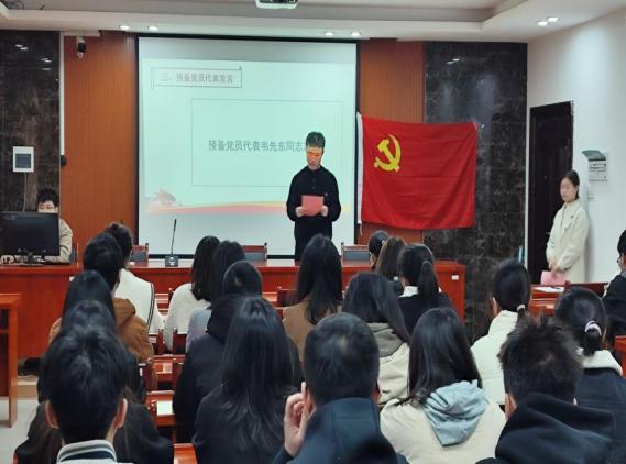 宣誓仪式在庄严雄伟的《国际歌》中拉开了帷幕,在刘俊老师的带领下,全体预备党员面向党旗,举起右拳,庄严宣誓,许下为共产主义奋斗终身的誓言。随后,预备党员代表韦先东同志上台发言,他表示将努力学习党的方针战略,树立终生学习的观念,追求真理,牢记全心全意为人民服务的宗旨,用实际行动践行誓言。接着,团委第二副书记杨涛总结了自己在预备党员培训中的收获和体会,并表示今后要更加严格要求自己、认真听党课、学习党的正确思想。最后,刘俊老师对加入党组织的新党员表示衷心的祝贺,并希望大家:一要牢记党的宗旨;二要加强理论学习;三要锤炼党性修养;四要树立良好形象。