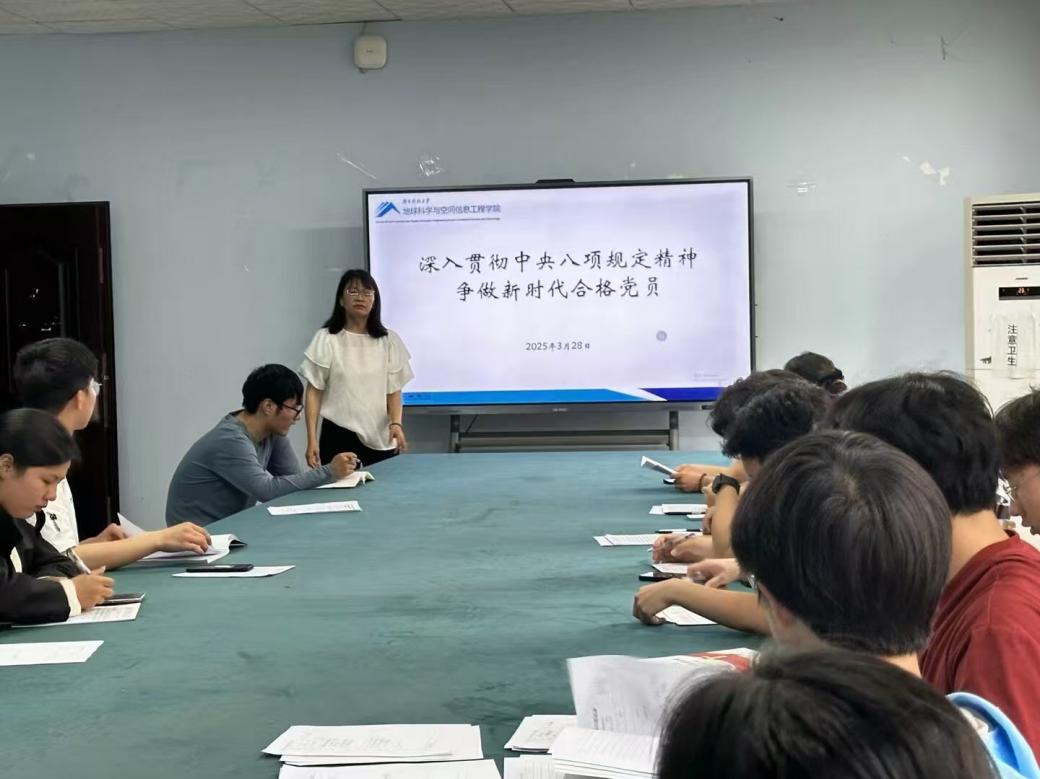 2025年5月1日下午,测绘系学生党支部书记刘俊在地学楼207为测绘系支部党员讲授深入贯彻中央八项规定精神学习教育专题党课,党课题目为“深入贯彻中央八项规定精神,争做新时代合格党员”。