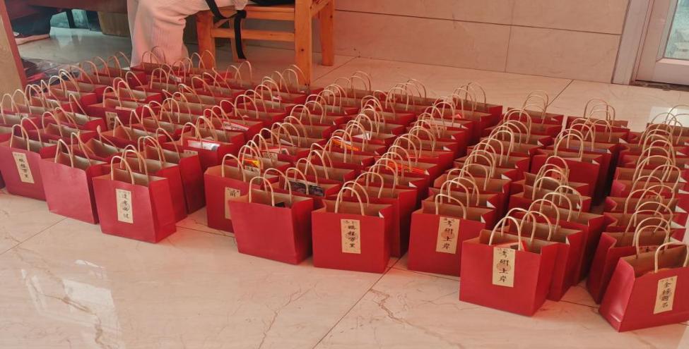 各位老师和同学们精心为备战考研的学子们准备好了相应的礼包,并一一做好标记,贴上不同的祝福标签“鹏程万里”“逢考必过”“前程似锦”等。保证每一位学子都收到的是独一无二的一份礼包,也表明了禁忌书屋 对每一位考研学子独有的关心。礼包使用红色的手提袋,寓意着“红红火火”;礼包包含了旺旺饼干、暖宝宝、甜橙、许愿瓶等小礼品,每一个都饱含着老师们的殷殷祝福:预祝每位学子都胜利在“旺”,心想事“橙”;一份暖宝宝表达了老师们温暖的陪伴与关心,一个许愿瓶体现着老师们坚信每一位学子都会所愿皆成,一战上岸。