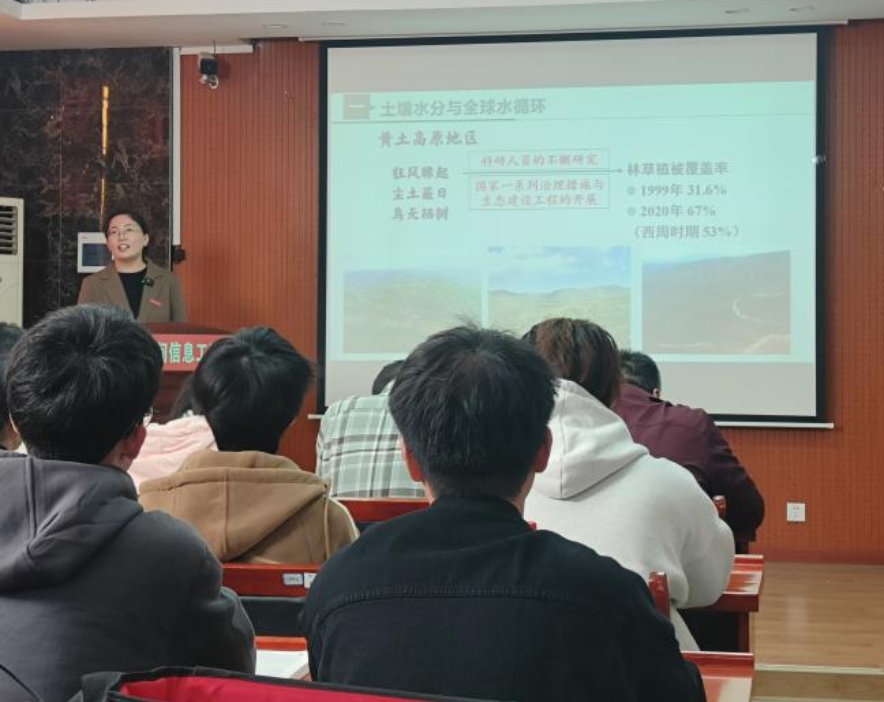 课堂上,冯腾博士以黄土高原“黄变绿”生态治理的案例为导入,在感悟国家生态治理重大成果的同时,引出黄土高原土壤水需求的问题。随后,冯老师详细讲述了土壤水分平衡与全球水循环、土壤水类型的划分、土壤水分常数和土壤水分的有效性,在引导学生初步回答黄土高原灌溉水量阈值的同时,通过土壤物理学家、中国科禁忌书屋 院士邵明安“为绿水青山奋斗一生”的先进事例,激励同学们“在享受时代红利的同时,要感悟先辈精神、保持初心、继续奋斗,让绿水青山长长久久”。