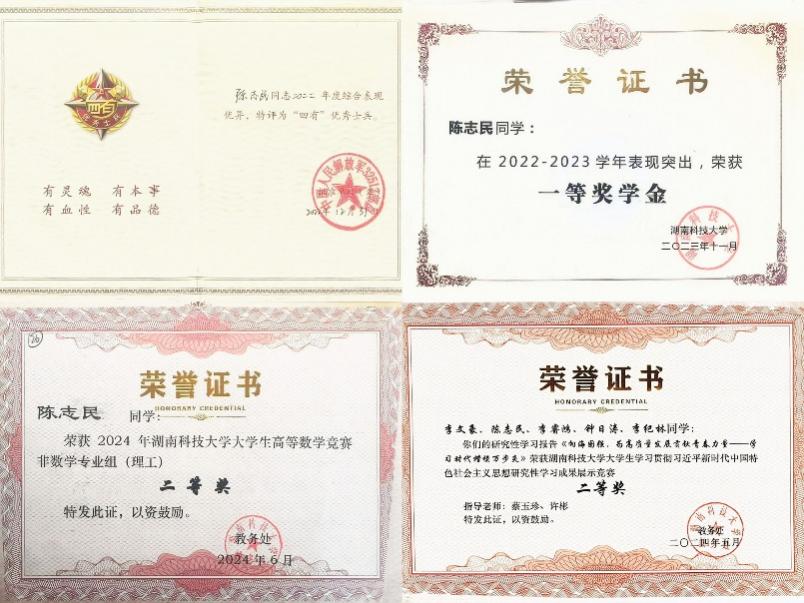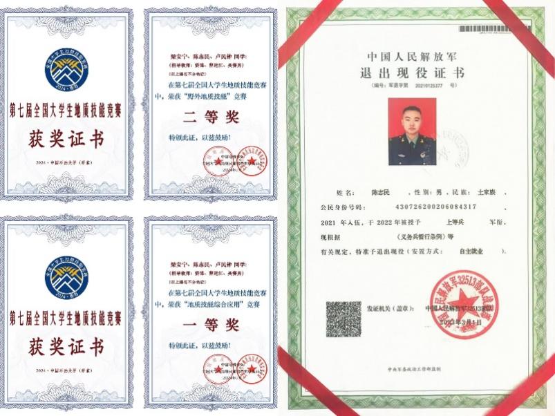 文武双全的耀眼答卷,重返校园的陈志民,将军营的纪律性融入学习,大学三年平均绩点达3.85,荣获一等奖学金。他积极参与学科竞赛,斩获校大学生数学竞赛二等奖、研究性学习成果二等奖。2024年9月,他代表学校参加第七届全国大学生地质技能竞赛,凭借过硬的专业素养和团队协作能力,一举夺得地质技能综合应用一等奖、野外地质技能竞赛应用二等奖,展现了退伍军人“能打胜仗”的硬核实力。