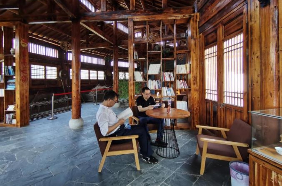 走到三面环水的昭山晴岚书院研学基地,该基地以乡村记忆馆的形式深深吸引了同志们。馆内设置的竹子云、蚁穴、秋千船、风车、浮桥、茅草屋等艺术节点,通过巧妙的设计使其与景观农田恰到好处的融合,也集聚了乡愁记忆、农耕文化的展示基地,呈现了一片特色、雅致、安静的文化场所。馆外秋日暖阳的普照,小河潺潺的流水,山上的层林尽染,馆内龙四春和刘贤赵同志默默拿起充满墨香的书本,静静的阅读着。